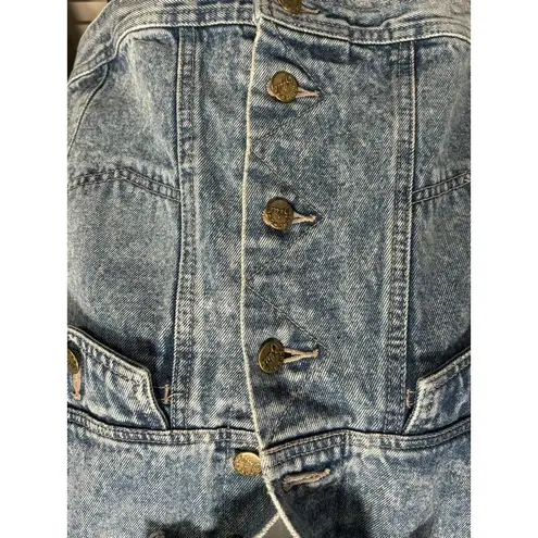 This Anchor Blue light wash crop button up jean jacket is perfect for any occasion, whether it's for travel, workwear or casual wear. Made of 100% cotton denim fabric, this jacket features a classic 80s style with a short length and long sleeves. It also has pockets for convenience and a button closure. The jacket is machine washable and has a regular fit, making it comfortable to wear. It comes in size M, is 19.5" pit to pit, 19" length, 16.5" across bottom and has a solid blue color. This jacket is a great addition to any wardrobe and is perfect for all seasons. ***Lining under collar is ripped in back of neck*** (B205)