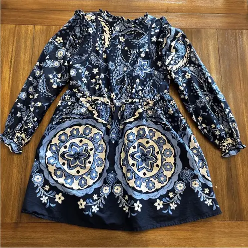 The &Merci Printed Ruffle Mini Dress in Navy Medallion is a stylish and feminine choice for small-sized women. Made from comfortable cotton material, this long-sleeve dress features a flattering ruffle accent and a tie neckline. The hand wash only care instruction ensures the longevity of this chic and short dress, perfect for adding a touch of elegance to any outfit. With its beautiful blue medallion pattern and high-quality construction, this dress is a must-have for any fashion-forward wardrobe.
