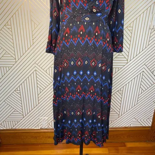 Beautiful & Other Stories midi length dress in black with allover blue, red, and metallic gold geome... Show more