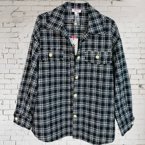 Andree Unit Plaid Tweed Shacket Pearl Buttons Black White Gold Thread 2 Hand Pockets 2 Faux Top Pock... Show more
