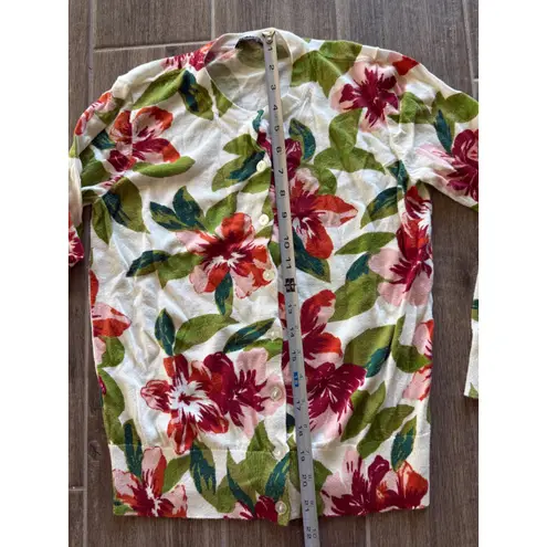 Ann Taylor Factory floral print cardigan sweater in white with vibrant red and green blooms. This lo... Show more