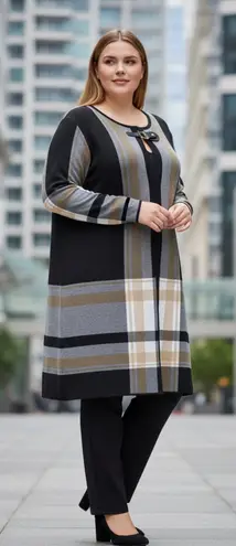 Anne Klein longline open-front cardigan in a timeless multi-color plaid pattern featuring black, whi... Show more