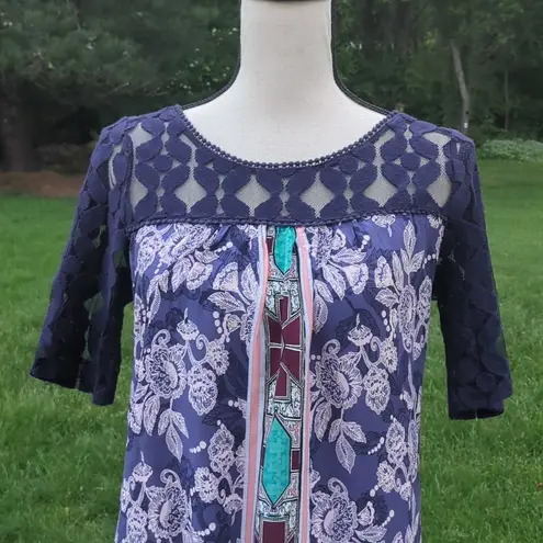 AKEMI + KIN | Anthropologie Size small blue multicolor Short Sleeve Tunic Top. lace top and sleeves.... Show more