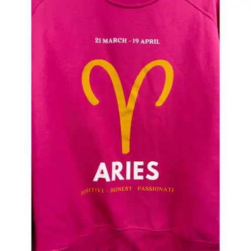Anthropologie crewneck sweatshirt in bright pink with Aries zodiac graphic. Features the Aries symbol, dates March 21 - April 19, and descriptive words Positive Honest Passionate. Artwork by Catherine O Sullivan. This sweatshirt offers a comfortable fit with its classic crewneck and long raglan sleeves.