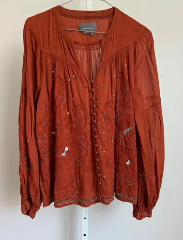 Anthropologie Blouse Top Small Embroidered Sequin Boho Bohemian Button Up Rust Charming Anthropolog... Show more