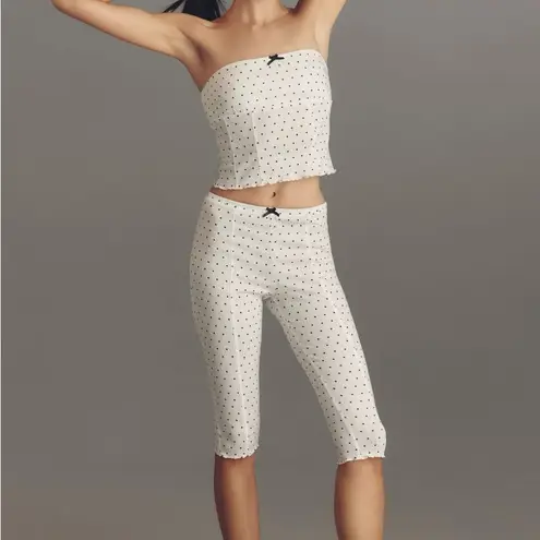 Elegant strapless top and capri set. Features black polka dots on white. Ideal for casual wear.