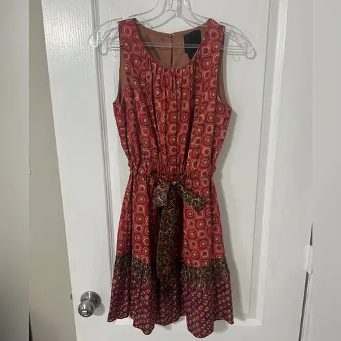Chic sleeveless midi dress with a vibrant red and brown pattern. Features a stylish waist tie for a... Show more