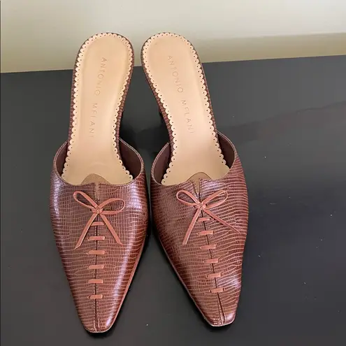 These shoes look in amazing condition. They are a small kitten heel pointed toe glove fit mules.