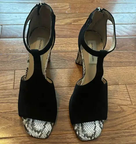 Antonio Melani Hilloray open toed dress heels leather suede snake print heel, zip back closure Size... Show more