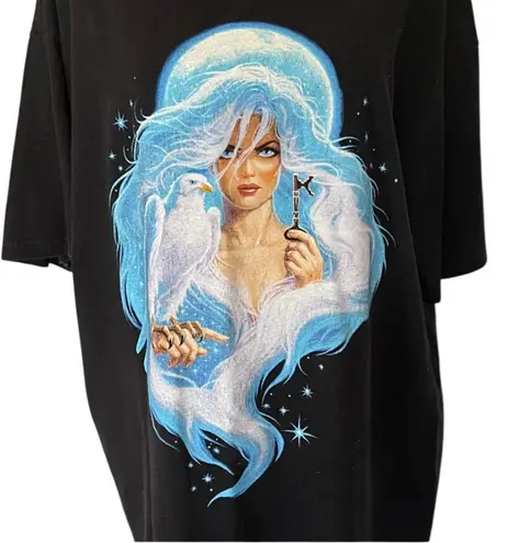 Black with blue graphic prints TSO white dove graphic Round neckline Short sleeves Flaw - spit/stain on top left, otherwise in good condition. Cotton Machine wash 23" shoulder to shoulder 24" pit to pit 28.5" long Size XL L1194 Stain/spot on top left (see photo).