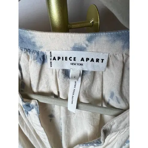 Apiece Apart Mitte Top Sz. L Retail $245 Excellent condition! Measurements Taken: 26-29"L, 21" p/p Hand-dyed in the season’s Dipped Shibori Subtle puff sleeve with elastic cuff Open V-neckline with gathers at the banded collar Front button closure 45% Organic Cotton, 25% Cotton, 35% Linen