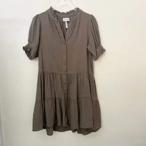 Apiece Apart believes in supporting, inspiring, and bringing women together by designing clothing to be a part of their story. They craft garments that are as versatile as the women who wear them collections that act as witnesses to our lives, intended to be worn on repeat for years and never go out of style. They mindfully work to be craft every collection sustainably and responsibly, using organic, ethically-sourced, and biodegradable fabrics and natural fibers as often as possible. Gathered ruffles at neck, front snap closure, slight puff-sleeve with elastic at cuff, delicate gathers at the waist, single-tiered skirt. 67% Cotton, 33% Viscose Hand wash cold, lay flat to dry, or dry clean Fits true to size. Made in India Width across chest from pit to pit: 20.5” Length from shoulder to hem: 32” Condition: excellent pre-owned
