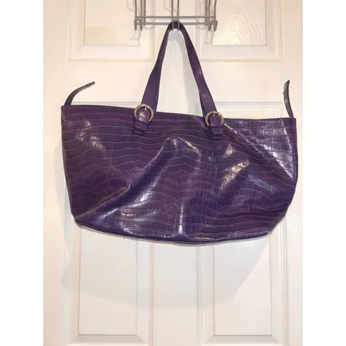 Statement Apostrophe tote bag, presenting a faux crocodile texture and a deep purple hue. Featuring dual shoulder straps accented with gold-tone buckles, this bag offers a blend of style and functionality. The interior reveals a spacious compartment equipped with a zip pocket and a snap closure for added security. Designed for carrying essentials, this tote is suited for shopping trips, weekend getaways, or everyday office use. Exterior Material: Faux Leather, Vinyl, Polyurethane Style: Tote Exterior Color: Raisin Department: Women Lining Color: Blue Handle/Strap Color: Purple Handle/Strap Material: Faux Leather, Polyurethane, Vinyl Lining Material: Fabric, Polyester, Nylon Hardware Color: Gold Pattern: Croc Embossed Character: None