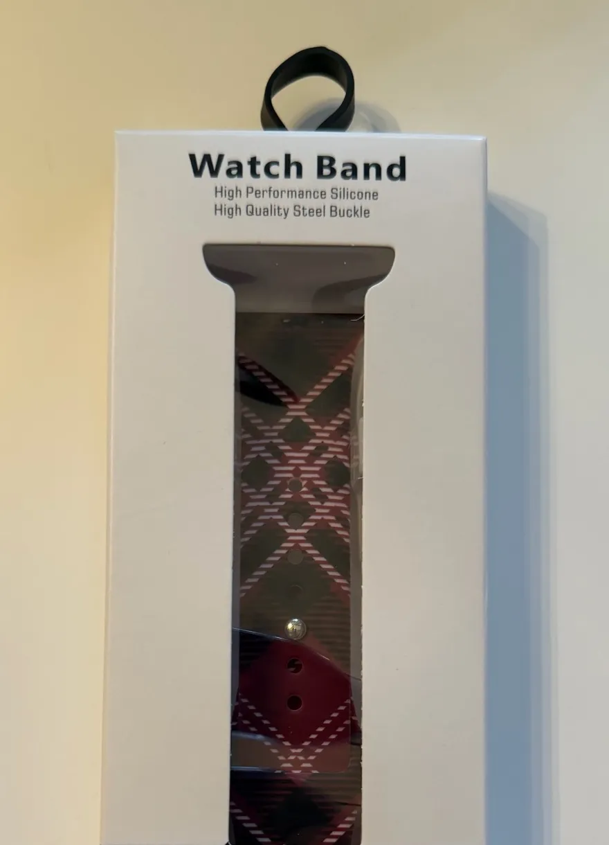 The is the perfect Apple Watch band for a University of South Carolina Gamecock, Harvard, Northeastern University, San Diego State, Davidson College, with the dark red (garnet, scarlett, cardinal, maroon) black and white plaid. Unique design. Brand new, in packaging. Never worn. Perfect unused condition.