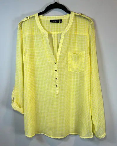 Apt 9 V-Neck Half Button Up Popover Blouse Yellow White Grid Window Pane Pattern Pullover Roll-Tab S... Show more
