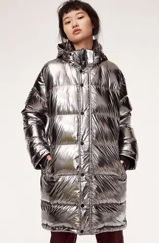 Size S Worn few times No damage or flaws! Mid length Silver metallic color