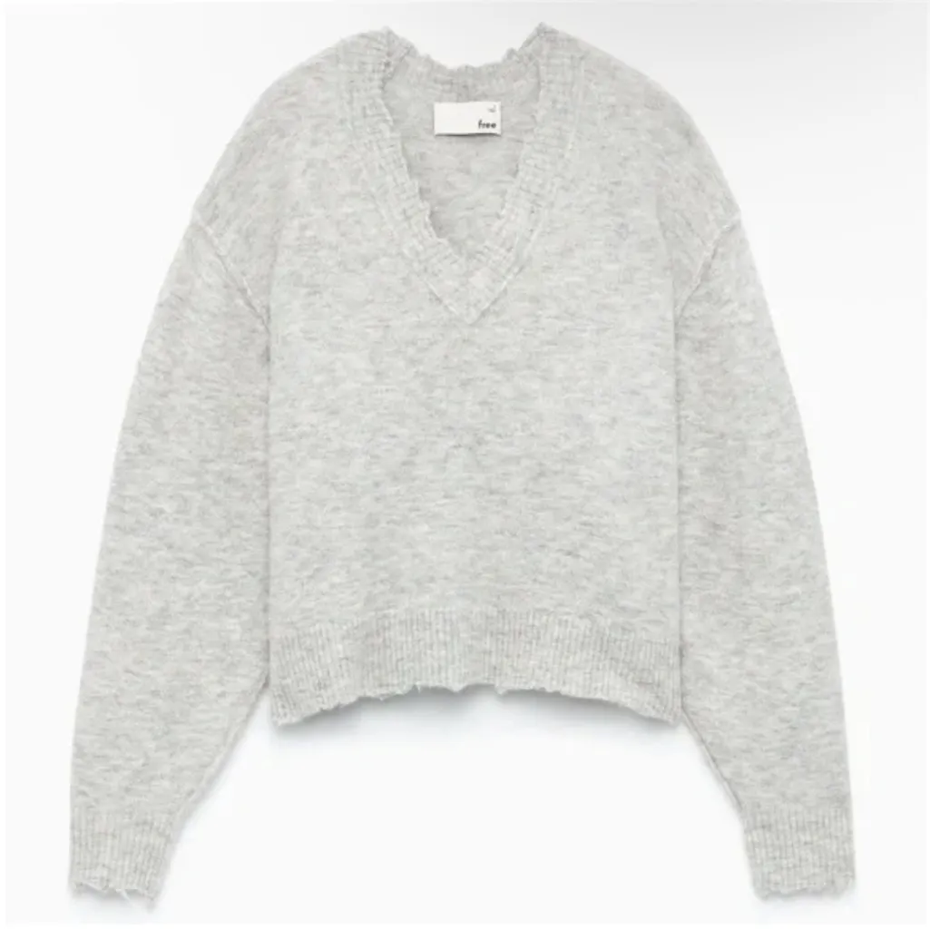 Light gray sweater in a wool blend. Intentionally distressed/jagged hem and cuffs and neckline. In excellent pre-loved condition; worn once or twice. Size 1 free sizing — fits XS/S with an oversized fit. Length: 20.5 inches Bust: 22.5 inches (but it’s very stretchy)