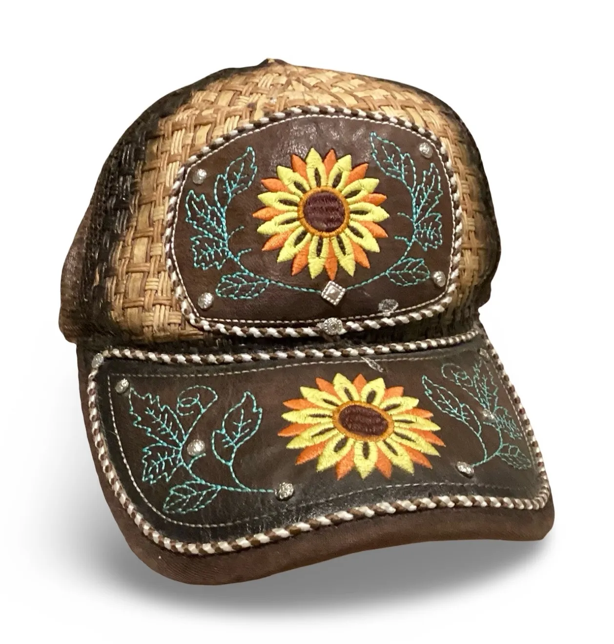 The Sunflower Western Cap combines natural beauty with a ranchero touch. Western trucker design with sunflower embroidery, curved visor, and durable front panel. Multimedia design combining vegan leather, polyester mesh and canvas lining. Brand new, but no tags. There are 2 tiny spots from improper storage. Please see last image. These are probably washable. SnapBack. One size fits most. Made in Mexico Thanks for looking CA1