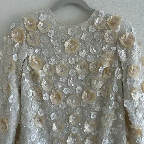 Gorgeous floral sequin embellished long sleeve mini shift dress with an open back and ribbon tie det... Show more