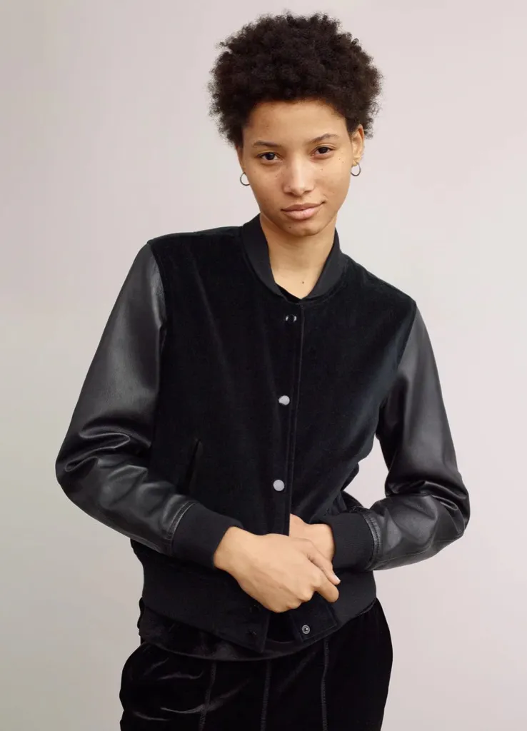 Chic black bomber jacket featuring gold button details. Leather sleeves add a stylish touch. Ideal f... Show more