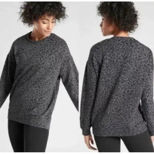Elevate your activewear with this Athleta Pure Luxe sweatshirt. The grey black leopard print adds a... Show more