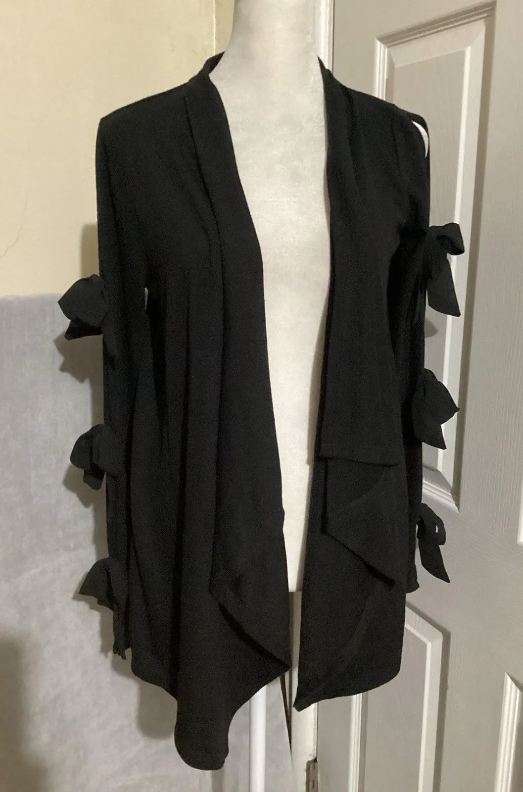 Brand: AUGUST SILK Item: Open-front cardigan sweater Gender: Womens Tag size: Small Pit to pit 19.5 Length 26 Color: Black Design: Draped, cascading open front with no closure Features: Long sleeves with multiple decorative bow accents along each sleeve Fabric: Soft knit blend (see care/content tag in photos) Brand label and care tag are shown in the photos Style notes: Lightweight layering piece suitable for casual to dressy outfits Special notes: Please review photos for details and compare to a similar garment for best fit.