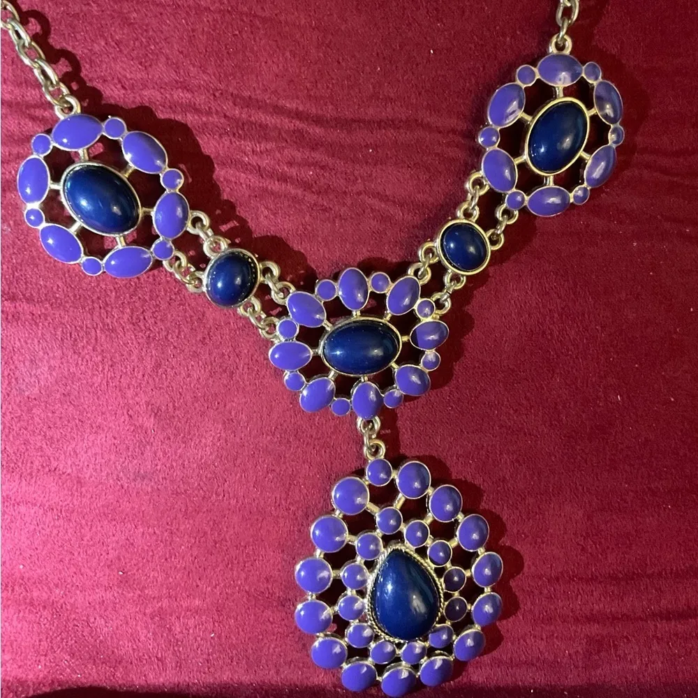 Stunning blue and purple necklace and earring set. Purple stones surround a single navy blue stone,... Show more