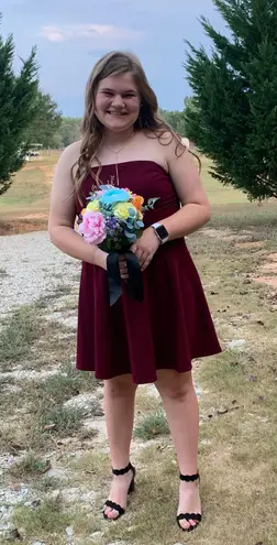 super comfy hoco dress, has see through, criss-crossed panels on the side. super flows and flatterin... Show more