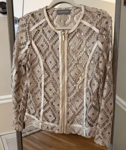 Elevate your look with this stunning Bagatelle lace jacket. Features an intricate geometric nude lace design with faux-leather trim and a gold front zipper for a modern, feminine touch. Perfect layered over a cami or dress for weddings, date nights, or elegant evenings out. Details: • Brand: Bagatelle • Color: Nude / Beige • Style: Lace zip-front jacket • Features: Sheer lace, faux leather trim, long sleeves, lined zipper edge • Size: [insert yours – likely M] • Material: Nylon/poly blend (lace overlay) • Condition: Excellent Style Tags: feminine | chic | dressy | neutral | classy