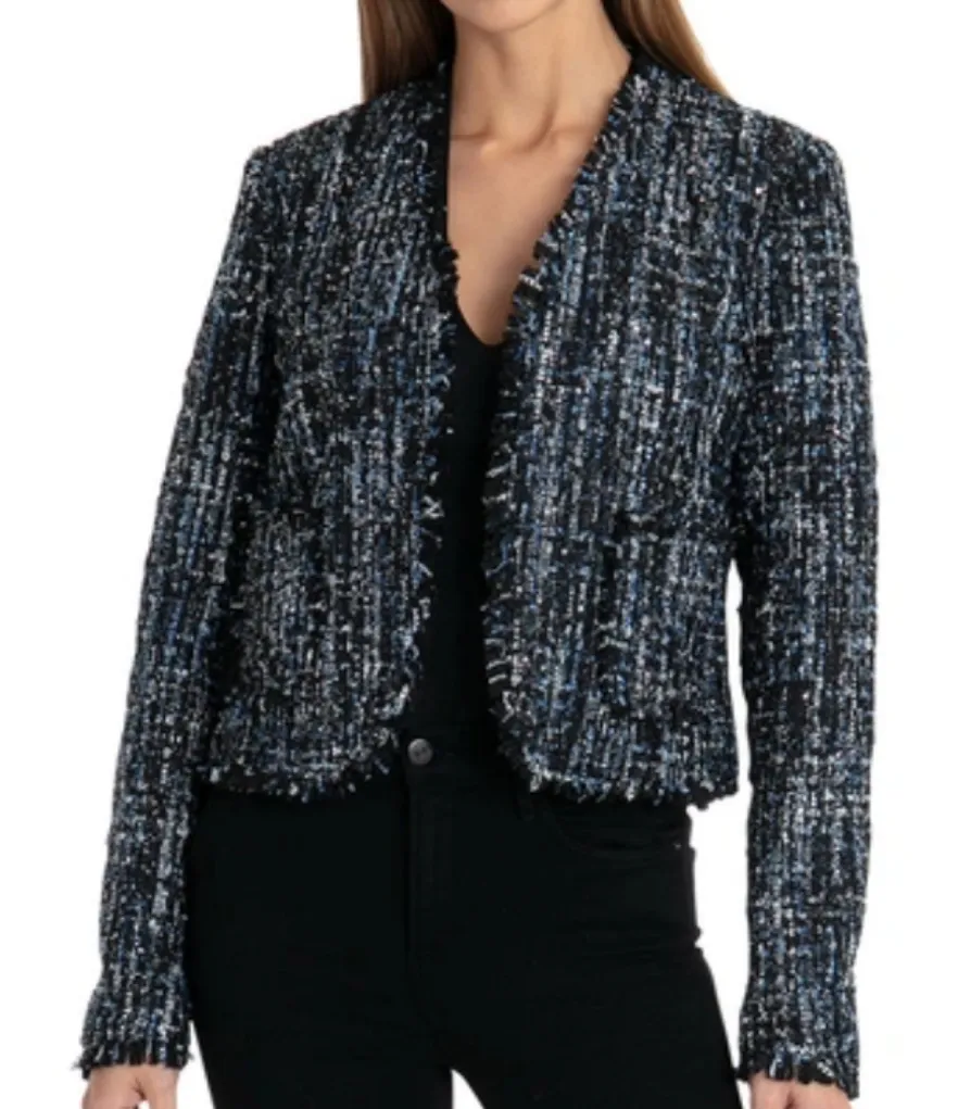 From Nordstrom Bagatelle Collection comes this Navy and Silver Metallic Tweed Biker Style Jacket in sz small. Fully lined, fringed detail,front pockets. Stunning combination of navy, silver metallic threading on black. A touch of white makes this piece pop with color burst. Measurements bust flat 17"... shoulder to hem 19.5". Slightly cropped design