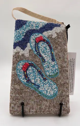 New with Tags 8" tall 5" wide 1" deep Exterior Material: Beads Style: Shoulder Bag Exterior Color: Beige Department: Women Lining Color: Beige Handle/Strap Color: Beige Handle/Strap Material: Canvas Lining Material: Canvas, Cotton Hardware Color: Black, Beige Pattern: Flip Flops Character: Beach Closure: Zip Bag Height: 8 in Keywords: beaded bag, flip flop purse, beach bag, summer handbag, small shoulder bag, beaded purse, novelty bag, beach theme, vacation bag, handmade bag, beaded clutch, women's bag, gift for her