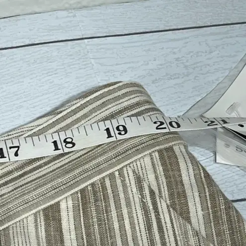 Stay cool and stylish in this chic Bar III tan and cream striped midi skirt in Size 16W. Made from a breathable linen blend, this skirt features a flattering button-down front, tie waist, and a comfortable fit. The vertical stripe pattern elongates the silhouette, making it a versatile piece for spring, summer, or resort wear.