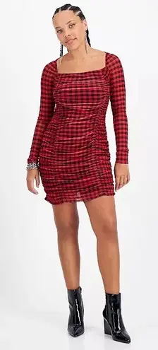 The BAR III Women's Large Red Black Checkered Mesh Overlay Ruched Bodycon Dress is a stylish and ver... Show more