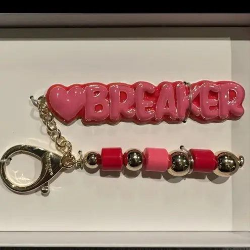 Stylish bag charm with 'Heartbreaker' text. Features pink and red accents with gold details. Perfect... Show more