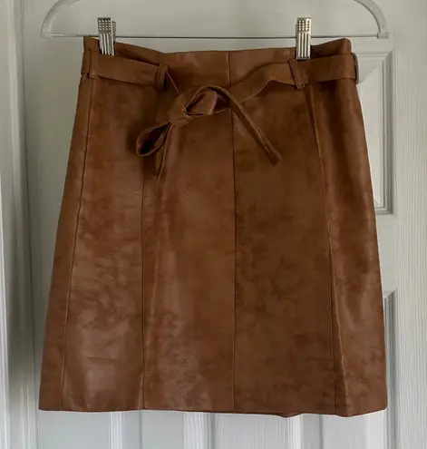 Stylish tan leather mini skirt with a chic belt detail. Perfect for a trendy look.