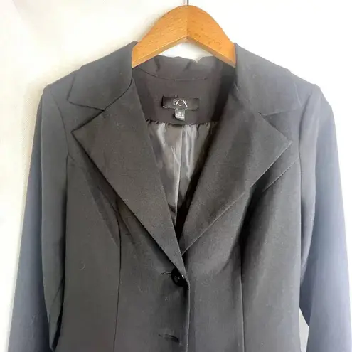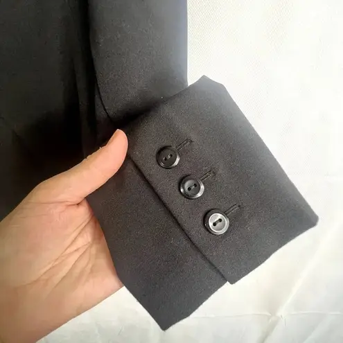 Black Collared, long sleeve, single breasted, faux front pockets 75% polyester/21% rayon/4% spandex Pit to pit 18.5" Office, work, workwear, business casual, professional, with jeans, layering piece, classic, chic, minimalist, conservative, neutral