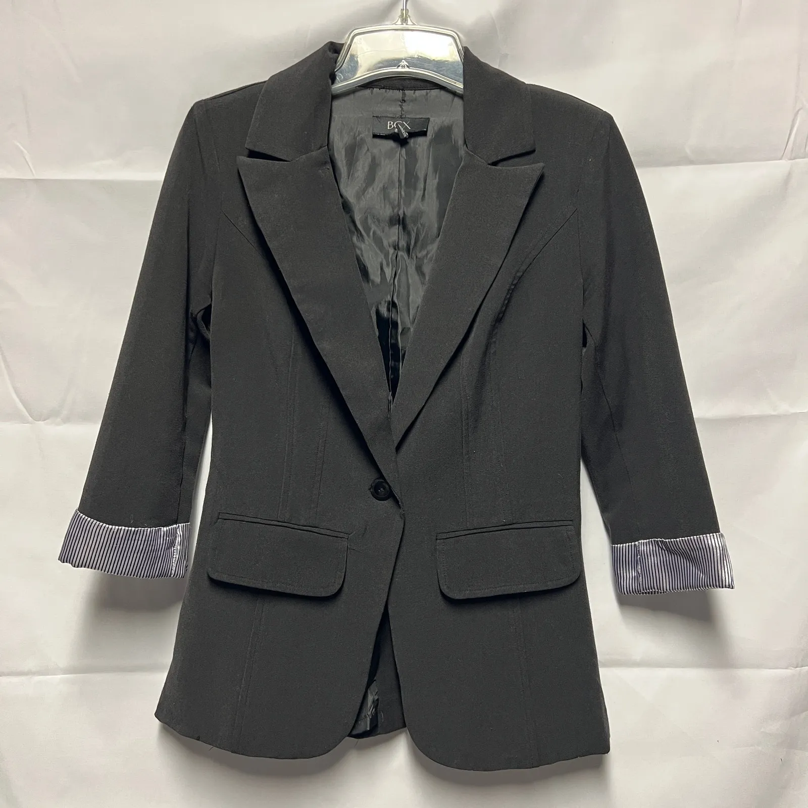 BCX women's black blazer jacket. Collared. V-neck. Button front. 3/4 folded sleeves. Faux front pockets. Lined. In good used condition. No stains, tears or holes. Polyester, rayon, spandex blend. Polyester lining. Machine wash. Office, Career, Business, Workwear