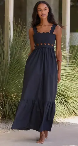 Step out in style with this elegant navy blue maxi dress. Perfect for any occasion, this dress features a chic design that flatters every silhouette. A must-have addition to your wardrobe. 100% cotton Scalloped trim Cutout waist detailing Tiered skirt Side seam pockets Back zip Machine wash Imported Beach Riot After gaining experience at Volcom and Tavik, Nicole Hanriot set out in 2012 to create her own line - an expression of her everlasting love for the beach. From printed two-pieces to cut-out maillots, the Los Angeles-based brand is known for its unapologetically bold swimwear, breezy apparel, and sunny take on the warm-weather wardrobe. BRAND NEW NO ORIGINAL TAG FREE SHIPPING