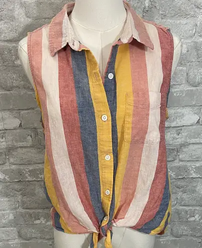 Chic sleeveless top with bold stripes. Features a button-down front and tie detail. Ideal for casual... Show more