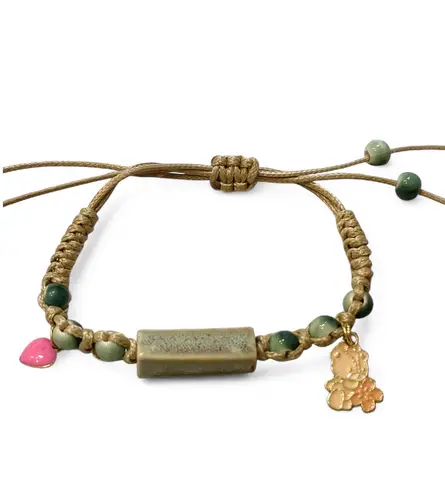 Bear Bracelet pink heart charm green tan boho cord beaded macrame ceramic - $12 New With Tags - From Diana