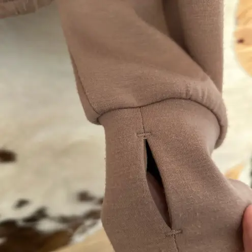 Comfortable tan 1/4 zip pullover. Features adjustable drawstring hem. Ideal for layering.