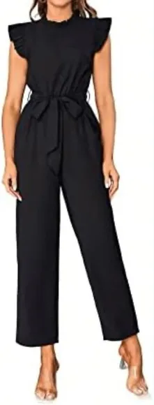 Chic black jumpsuit with ruffle sleeves. Features a tie waist for a flattering fit. Ideal for versat... Show more