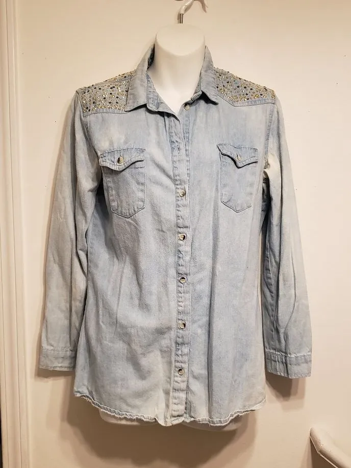 EUC size M light wash denim button up top. Very bedazzled shoulders and upper back. A few stones are... Show more
