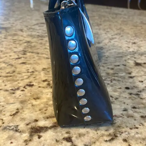 The Beijo Black Patent Mini Bag boasts a sophisticated and timeless design, featuring a structured rectangular shape and sleek, minimalist lines. Crafted from solid black patent material, it is complemented by a curved top handle attached with silver metal hardware, making it an ideal choice for professional or formal occasions.