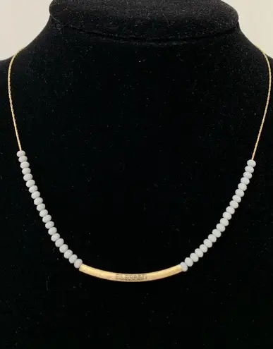 Inspirational blessed bar necklace surrounded by gray glass beads on a gold satin metal chain. Each... Show more