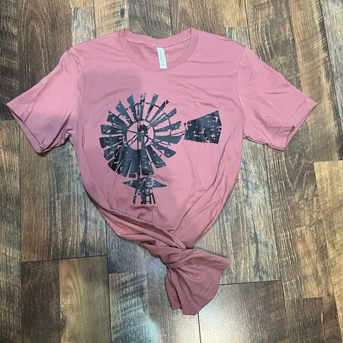Stylish pink t-shirt with a bold black windmill graphic design. Perfect for casual wear. Bella Canva... Show more