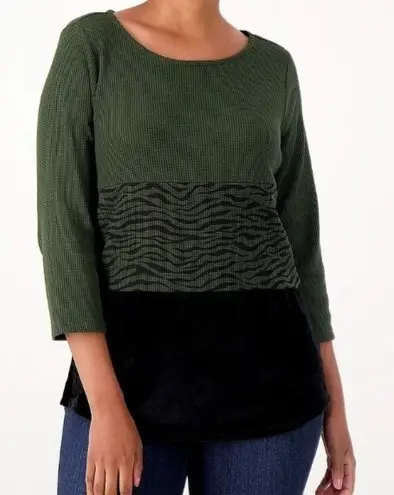 Discover a captivating blend of textures and patterns with this eye-catching Belle Kim Gravel top. The rich olive green waffle knit sleeves and upper bodice transition seamlessly into a bold black zebra print band, creating a striking visual focal point. A luxurious black velvet trim adds a touch of sophisticated flair to the hem, offering a flattering drape and a hint of modern elegance. This versatile piece is perfect for a casual brunch, a stylish evening out, or adding a unique touch to your everyday wardrobe. Measurements: • Bust: 25 in • Length: 27 in Type: T-Shirt Department: Women Style: Tunic Material: Polyester Blend, Cotton Blend Neckline: Round Neck Sleeve Length: 3/4 Sleeve Sleeve Type: Classic/Fitted Sleeve Pattern: Colorblock Accents: Slit Theme: Zebra Features: Slit Fit: Relaxed Fabric Type: Knit Occasion: Casual Closure: Pullover Keywords: waffle knit, velvet trim, animal print, three quarter sleeve, casual chic, statement top, relaxed fit, fall fashion, winter style, unique design, plus size fashion