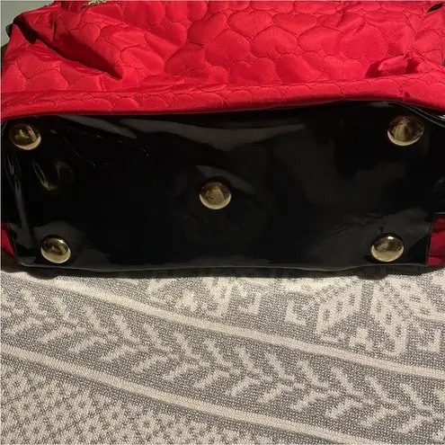 Features: Heart-quilted fabric, two front zips, large rear pocket, black patent trim, gold-tone branding, adjustable strap, signature Betsey charm