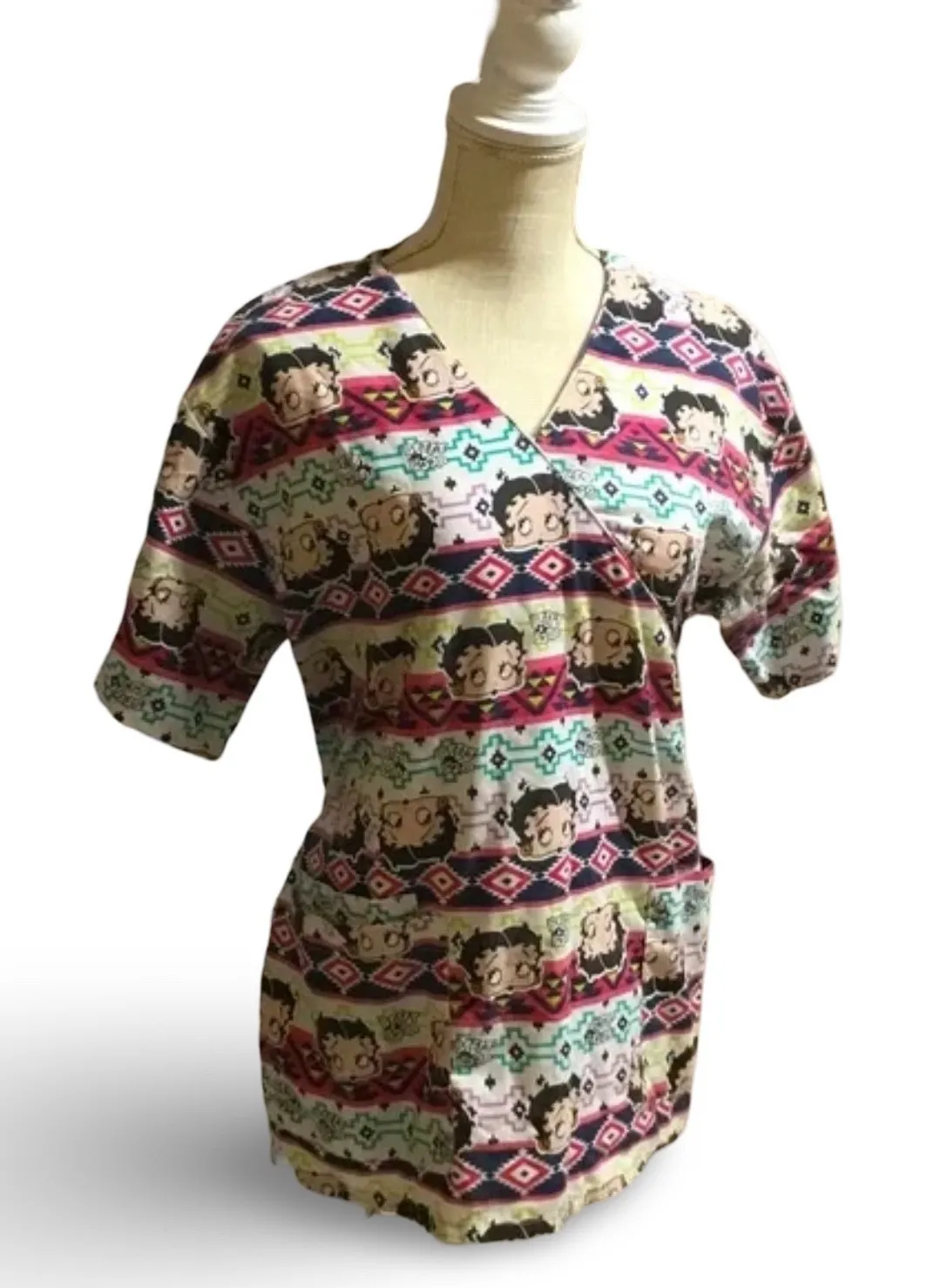 Medical scrub top featuring cute Betty Boop pattern all over. Wrap style. Ties in back. Size L Meas... Show more