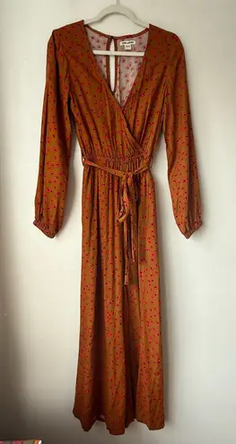 . Long sleeve jumpsuit. Mustard colored brownish-yellow with red and black floral print allover. tie... Show more